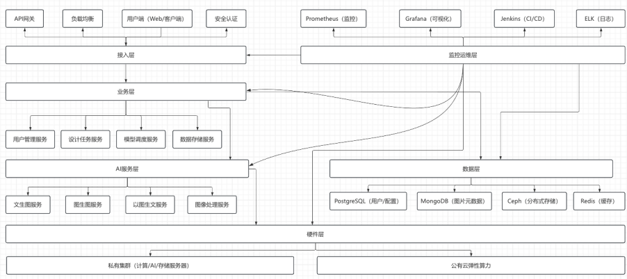 3. 高扩展性:微服务拆分支持按需扩展单个模块(如高峰期扩展 “文生图服务” 实例),硬件集群支持横向扩容(新增 AI 加速节点)。
